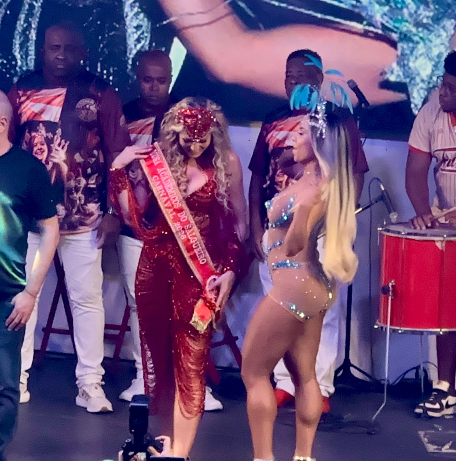 Com um look todo em vermelho e predarias , a sambou ao som da bateria furiosa