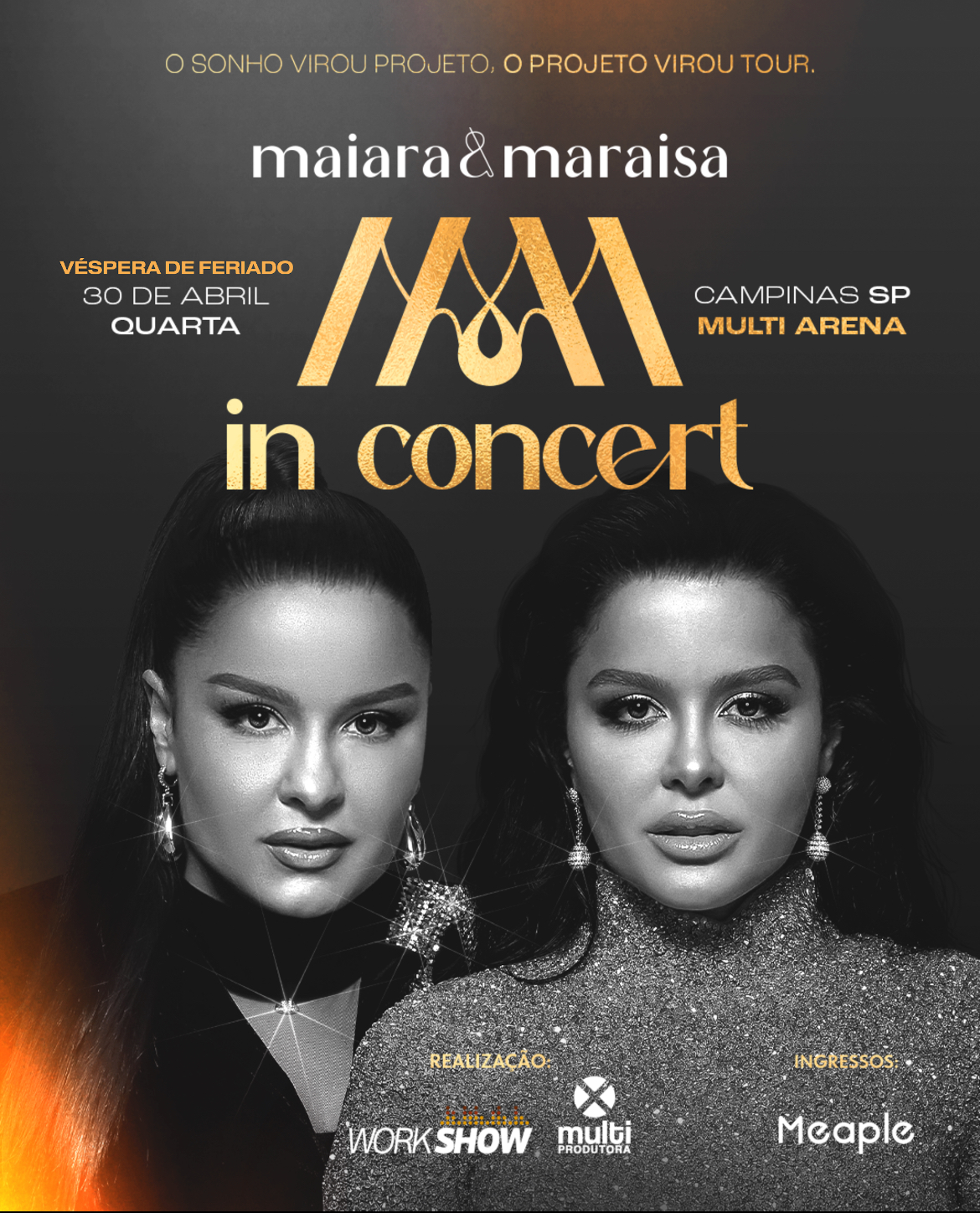 A dupla feminina número 1 do Brasil abre a temporada, apresentando pela primeira vez em Campinas o show ‘Maiara & Maraísa In Concert’, com orquestra composta totalmente por mulheres . Os ingressos estão no primeiro lote e podem ser adquiridos no link: https://multiarenacampinas.com.br/maiara-maraisa-in-concert/ a partir de R$120 (pista- meia entrada). Também é possível comprar Área Vip por R$140 e Camarote Open Bar para desfrutar da experiência de assistir ao show com uma visão privilegiada do palco, pertinho do bar.