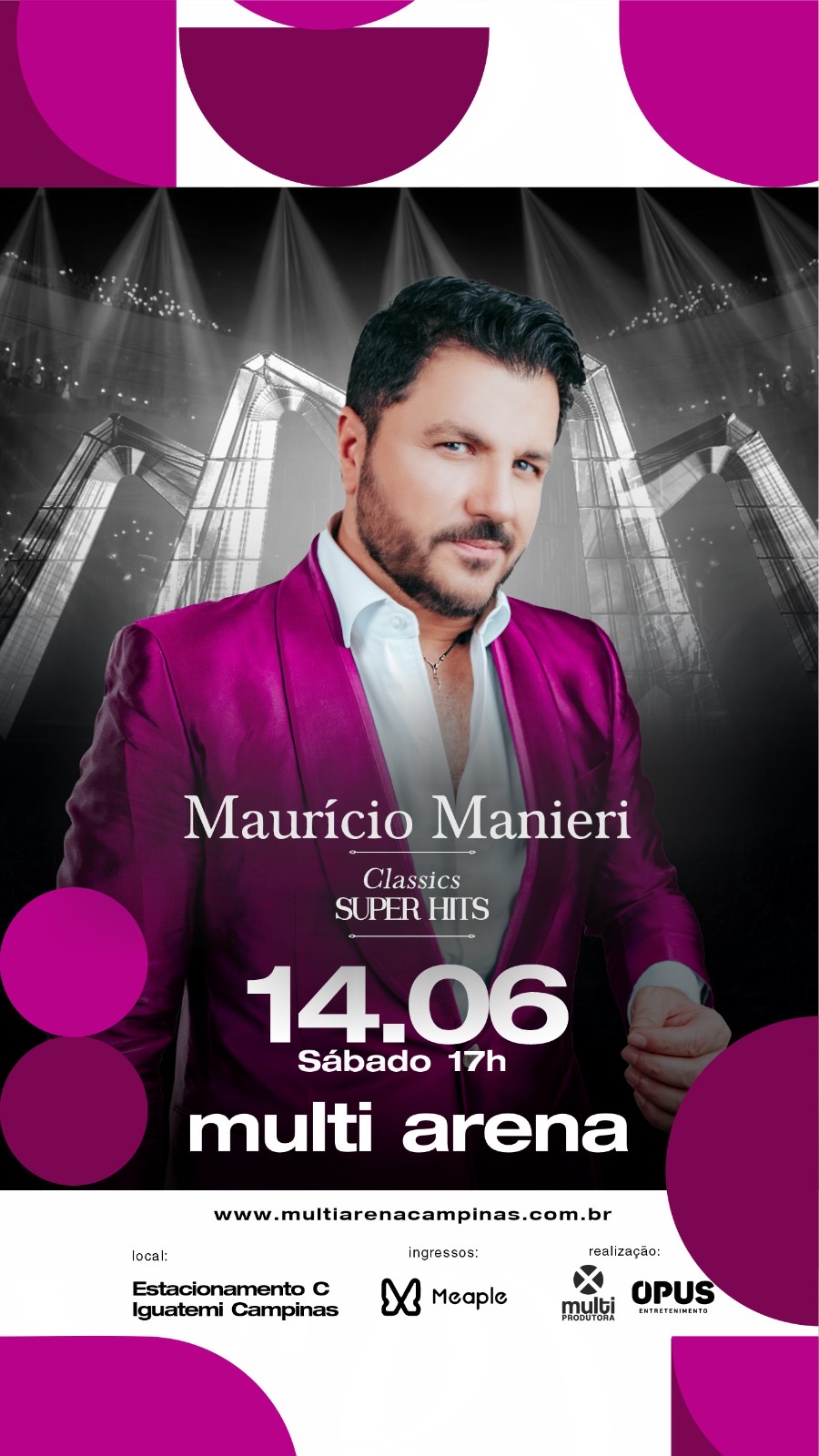 Maurício Manieri, um dos mais renomados artistas da música brasileira, está chegando na Multi Arena, mega estrutura montada no Shopping Iguatemi, para um show especial de Dia dos Namorados, com ingressos à venda no site. O cantor apresenta a nova versão de seu consagrado projeto Classics, que reúne sucessos de sua carreira e Super Hits dos anos 70, 80 e 90 que marcaram época. Com mais de 25 anos de trajetória, o artista é respeitado e aclamado pela mídia e público como um dos maiores showmen do Brasil e traz um espetáculo grandioso, repleto de canções emocionantes, dançantes e clássicos inesquecíveis do pop romântico nacional e mundial, na noite de 14 de junho, em Campinas.