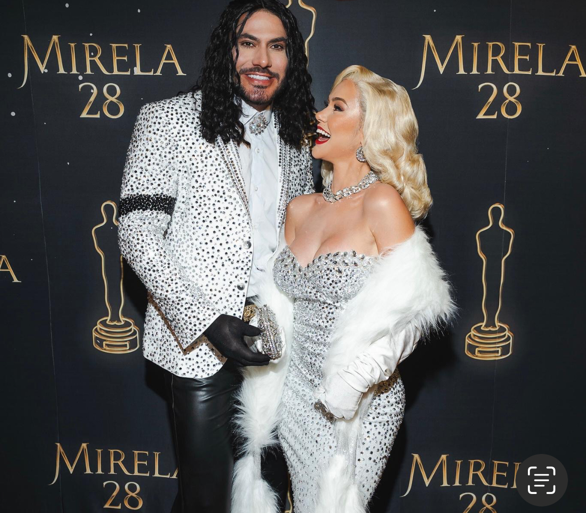 Logo na entrada, os convidados foram surpreendidos com uma superprodução assinada pela decoradora Sheyla Lucena, que transformou o espaço em um verdadeiro cenário de cinema. E o casal anfitrião entrou no clima: Mirela e seu noivo, Yugnir, surgiram caracterizados como Madonna e Michael Jackson, recriando os looks icônicos dos artistas no Oscar de 1991. A produção foi feita pelo estilista Kelvin Mendes, com styling de Wally Rodris.