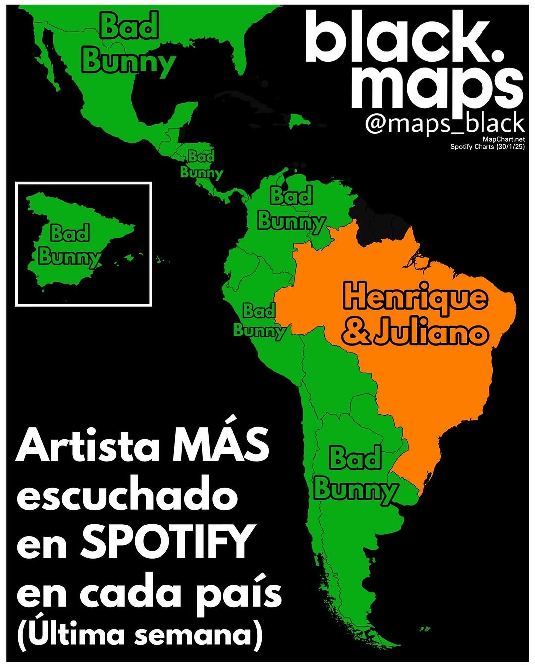 Bad Bunny conquistou quase toda a América Latina, o cantor só não alcançou o favoritismo brasileiro devido ao sucesso da dupla sertaneja que é evidenciado nos rankings e números expressivos em diversas plataformas. No YouTube, Henrique e Juliano acumulam mais de 18 bilhões de visualizações e possuem uma base de 16,5M de inscritos em seu canal oficial, no Spotify são 16M de ouvintes mensais. Henrique & Juliano lideraram o ranking de álbuns mais ouvidos no Spotify Brasil em 2024, com “To Be (Ao Vivo Em Brasília)” e “O Céu Explica Tudo (Ao Vivo)” ocupando as duas primeiras posições, respectivamente.