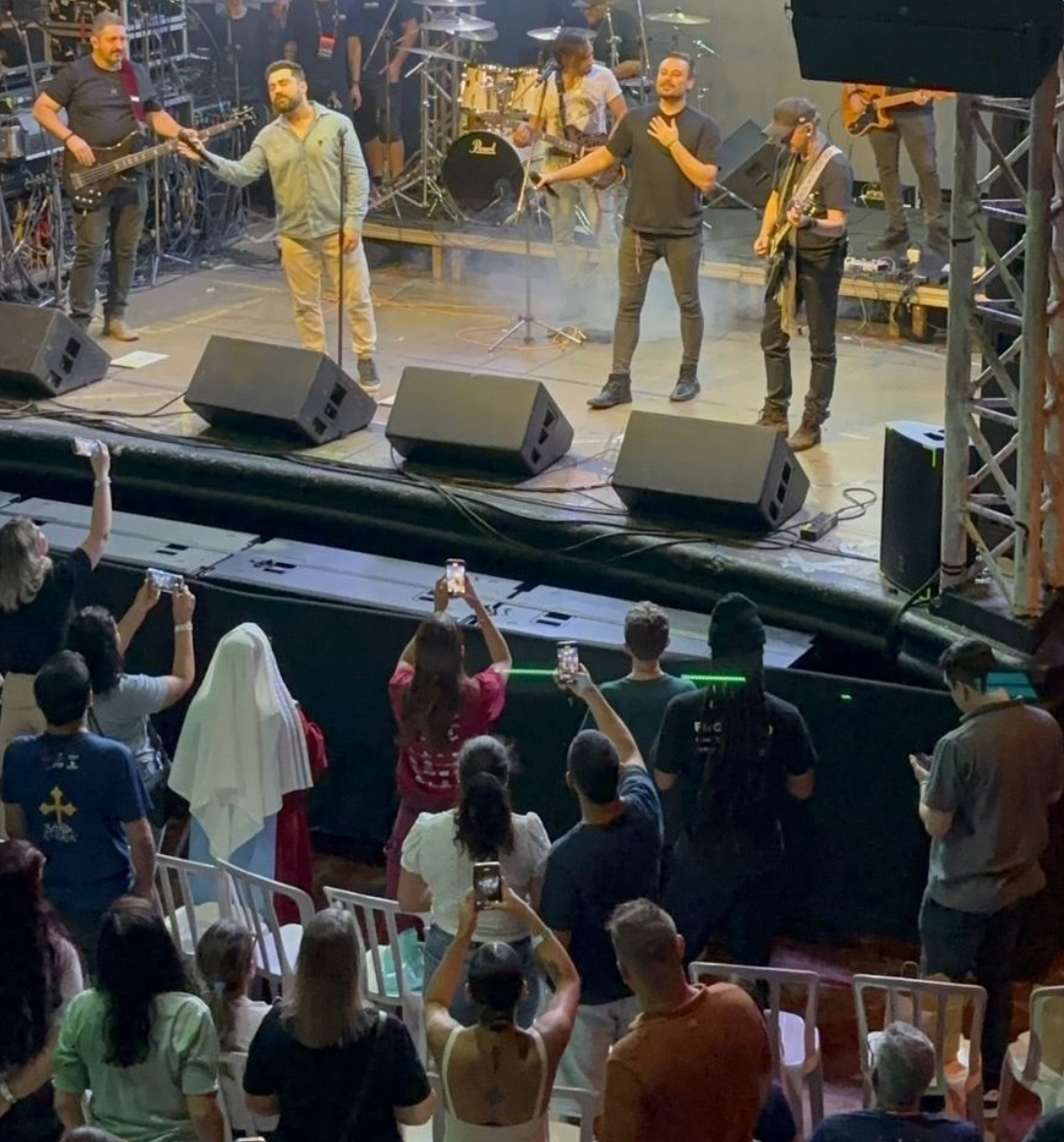 A montagem incluiu palco completo, sistema de som profissional, iluminação cênica e toda infraestrutura necessária que recebeu o público de jovens, fiéis, voluntários e peregrinos, que testemunharam o partilhar e operar de Deus.