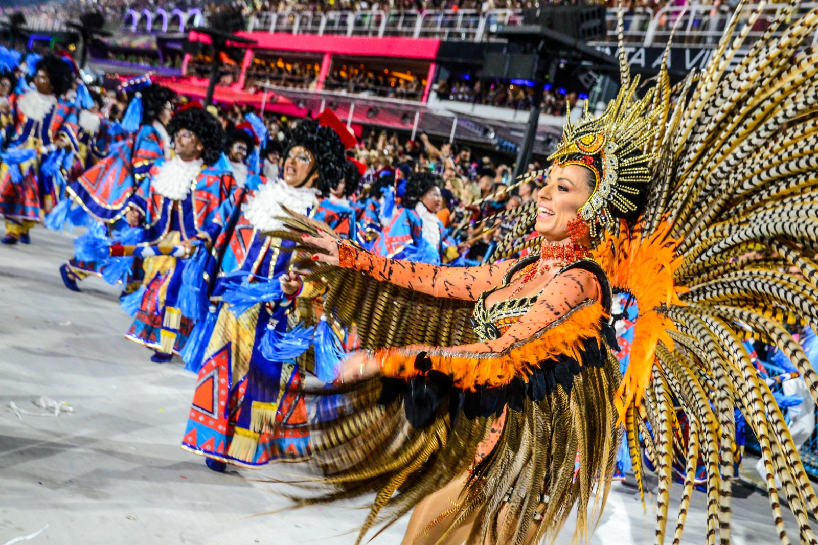 Composta por centenas de penas de faisões naturais e pedrarias, a fantasia chamou atenção por toda a avenida pela exuberância do resultado final.