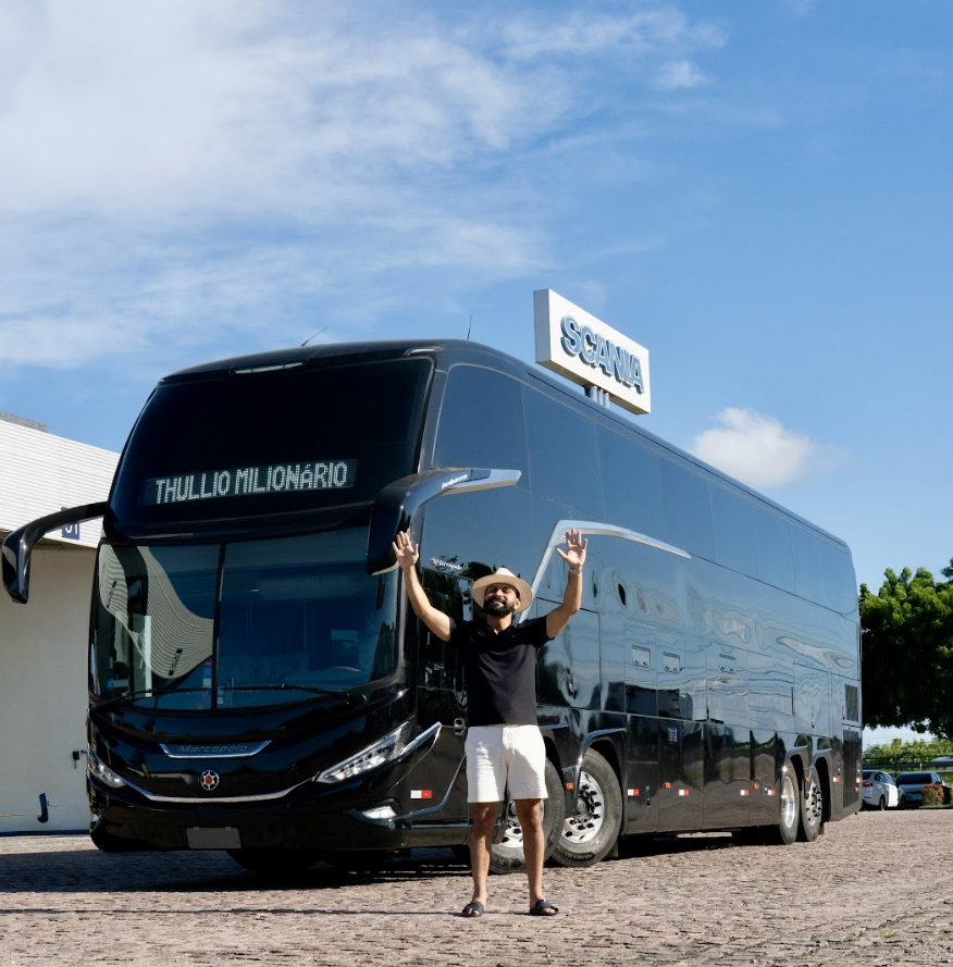 O cantor Thullio Milionário acaba de realizar um grande sonho: a aquisição de um ônibus super moderno para acompanhar sua rotina intensa nas estradas. O veículo escolhido é um Marcopolo G8 DD Paradiso 1.800, de 2025, com motor Scania K 500 8×2, que é sinônimo de conforto, tecnologia e sofisticação. Avaliado em R$ 2,7 milhões, o ônibus foi pensado para atender às necessidades do dono do hit “Casca de Bala” e sua equipe durante seus shows, oferecendo uma experiência única de mobilidade e bem-estar.